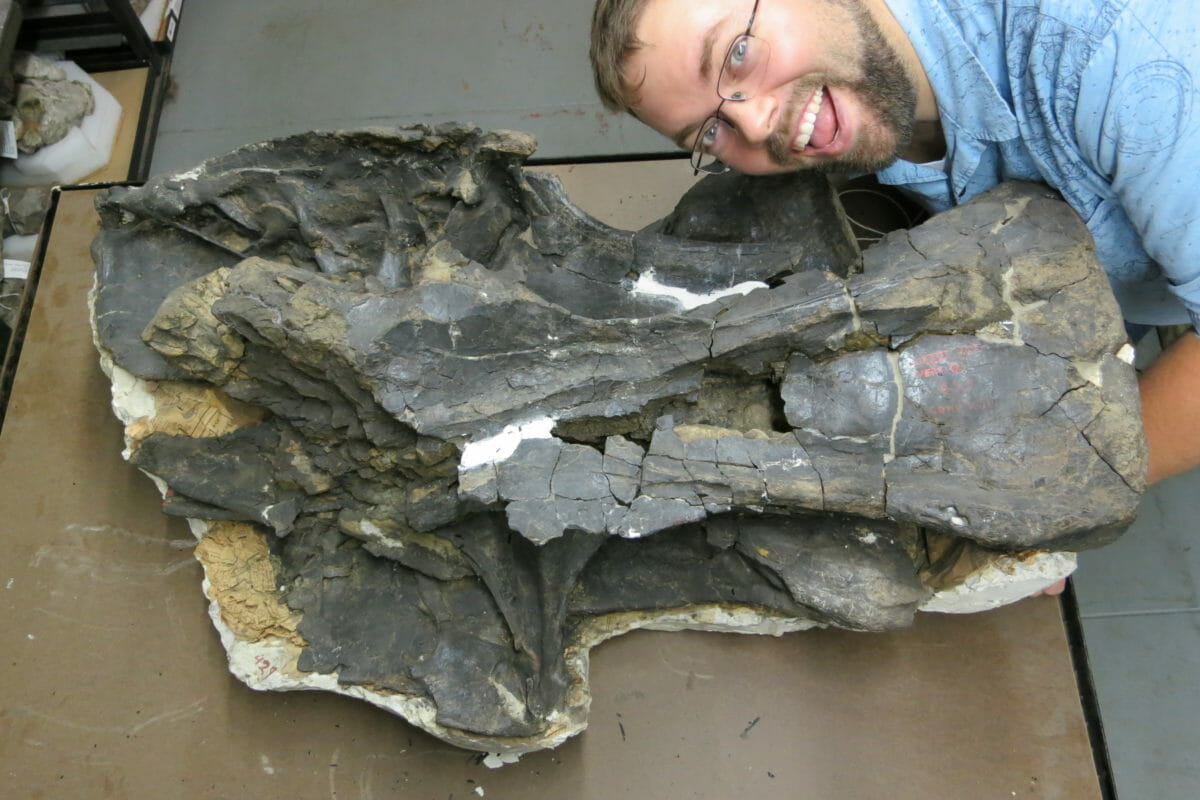 Dr. Wedel with a cast of a humerus of Brachiosaurus